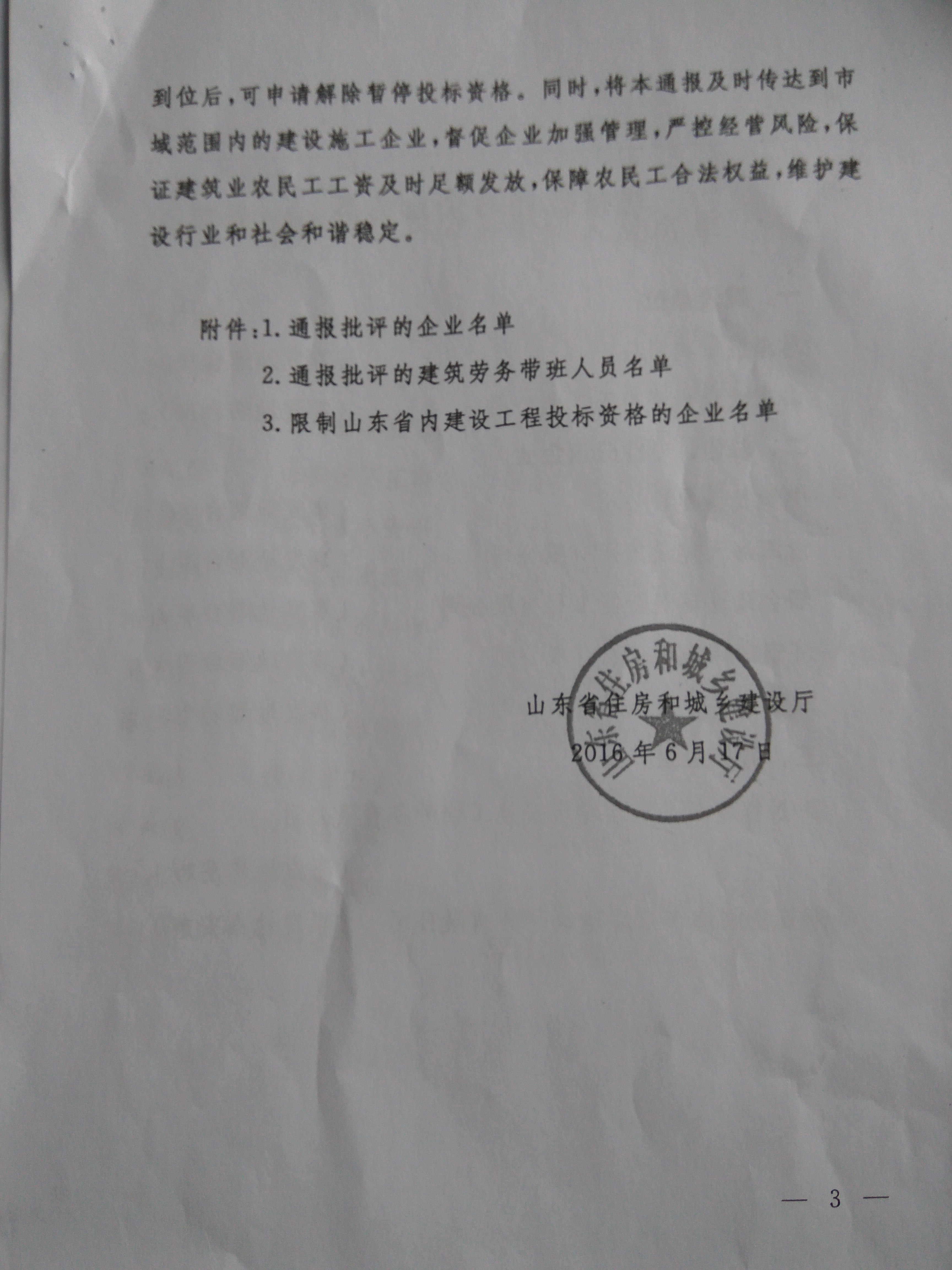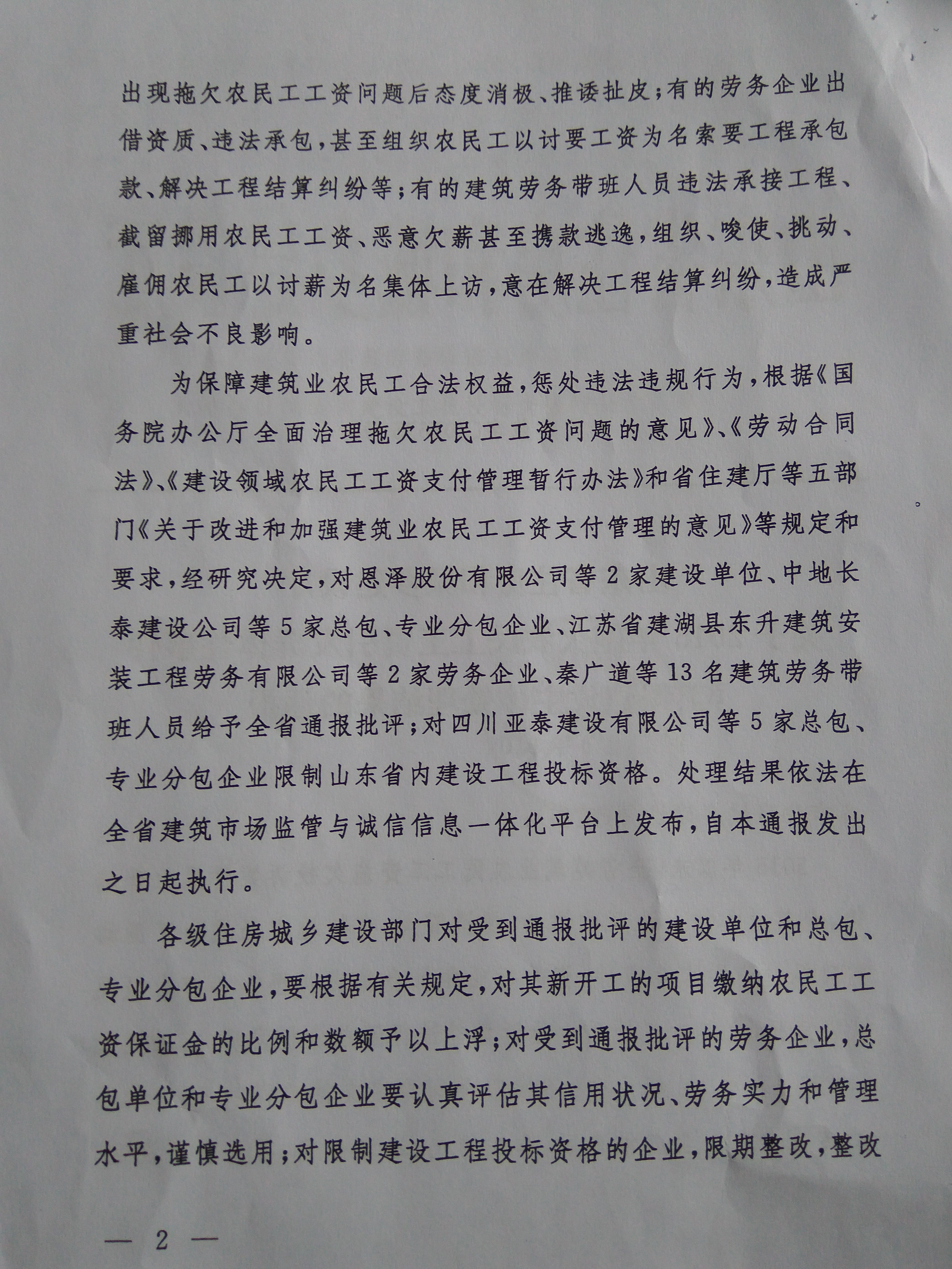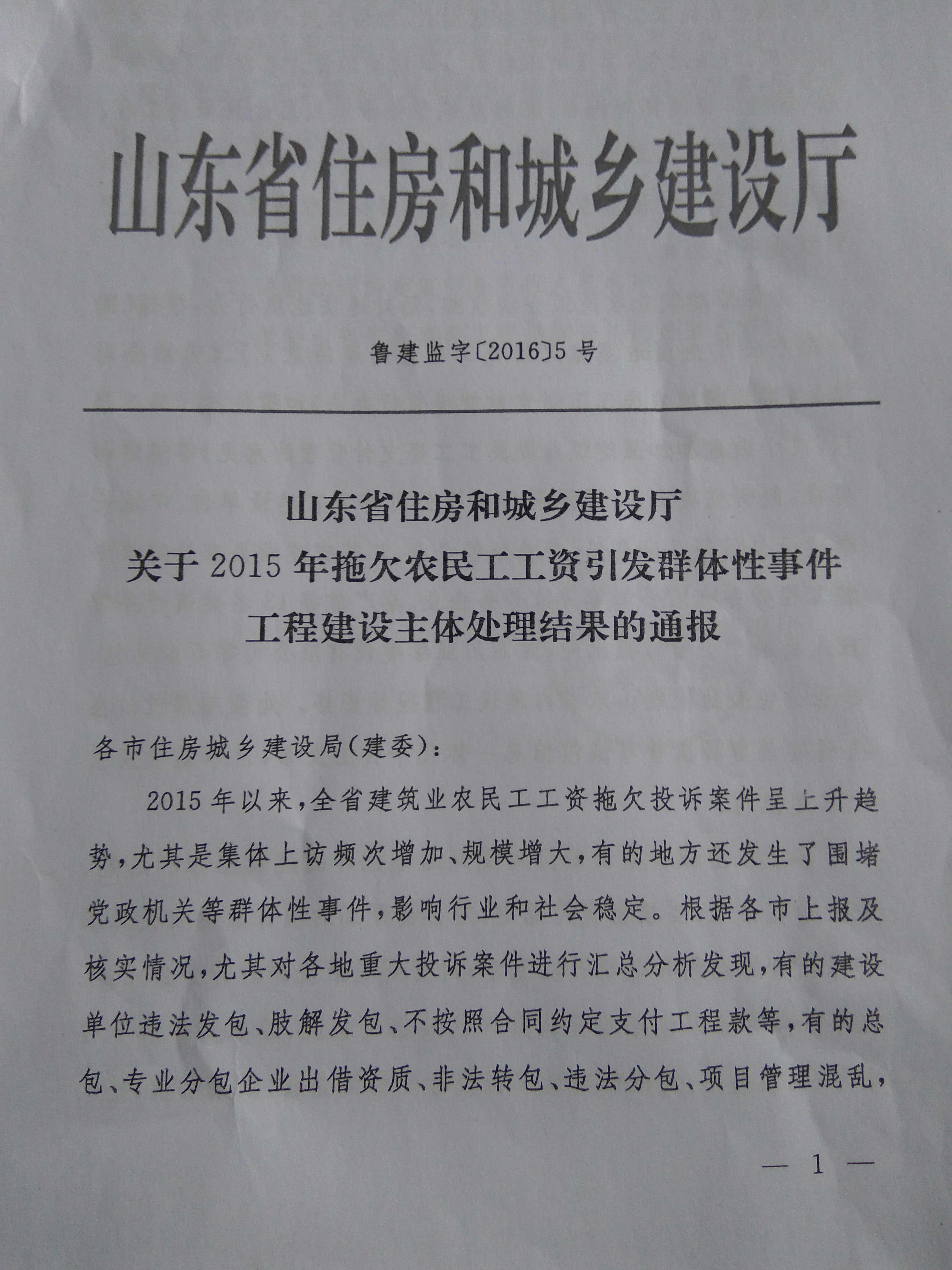 转发山东省住房和城乡建设厅《关于2015年拖欠农民工工资引发群体性事件工程建设主体处理结果的通报》